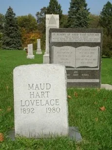 With both a gravestone and a tall monument, our Maud is pretty easy to spot from the road! This stone monument was erected in 1999 by the Maud Hart Lovelace Society. The heading reads, “Beloved author of the Deep Valley Betsy-Tacy stories, other children’s books and adult historical novels,” and the titles of her books are engraved on the front and back.