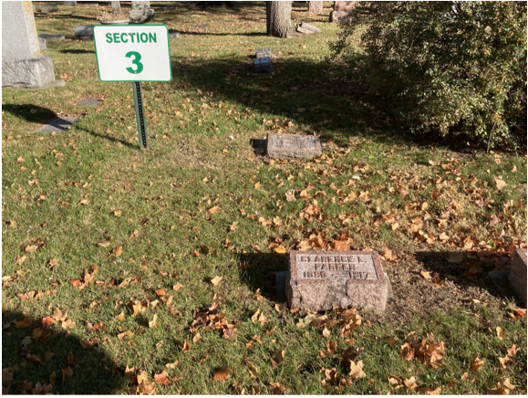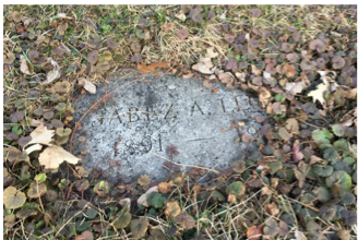 You can also use Mike Parker’s grave to find Emily Webster in Section 1. From Mike’s grave, walk 125 steps along the road (heading in the direction of Maud), staying to the right. Stop at the One Way sign and the big Fox stone, and walk 100 steps toward Glenwood Avenue. You’ll see Marguerite’s ledger stone near the large Marsh monument.